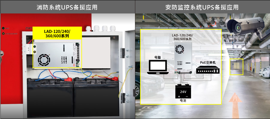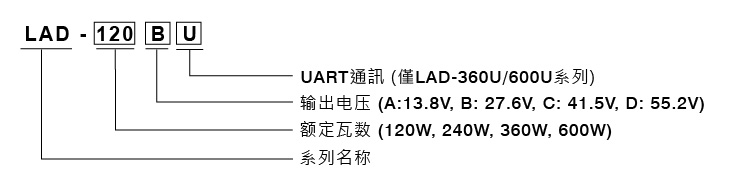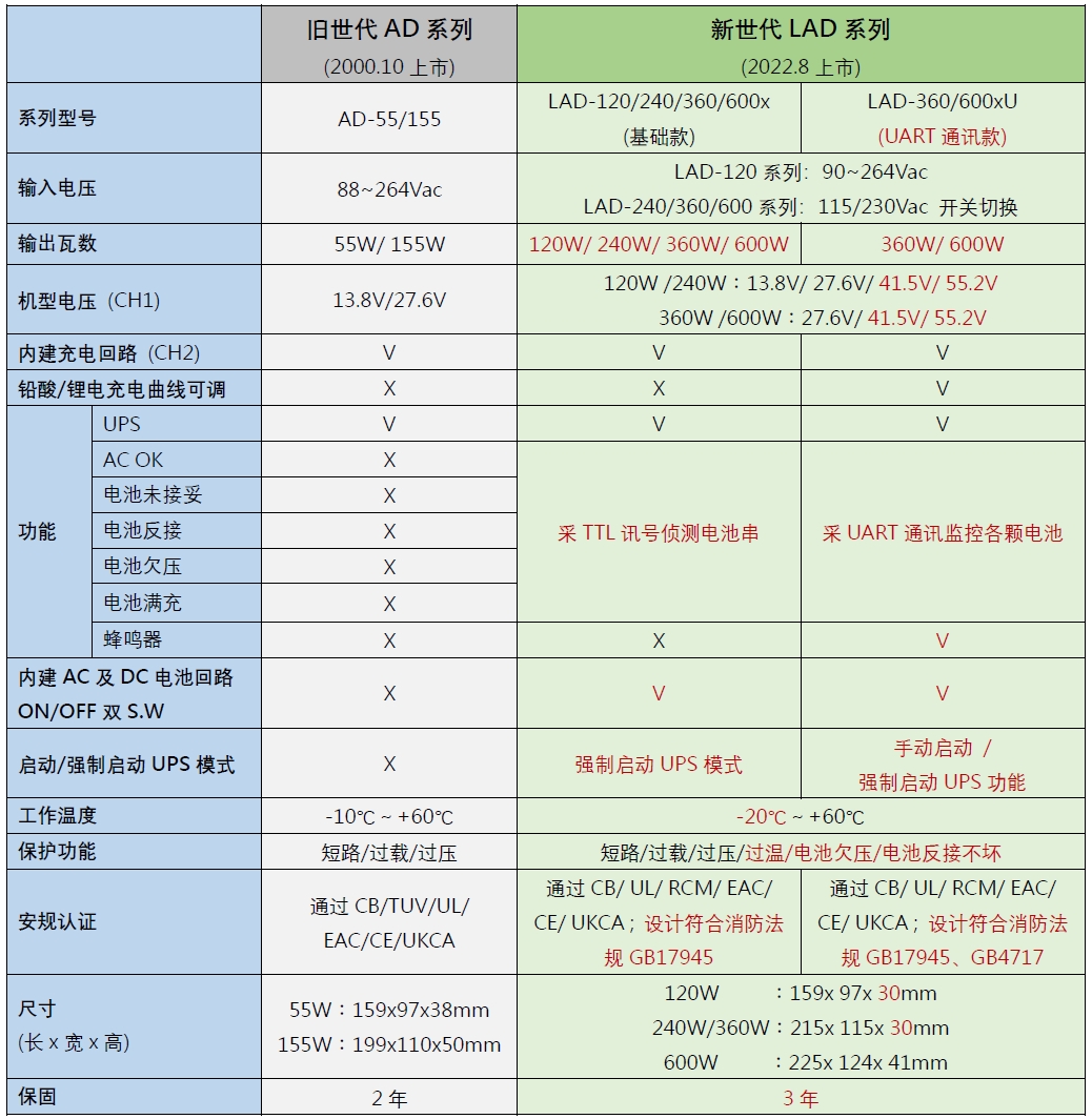LAD系列采1U薄型機殼設計,規(guī)劃有基礎款(LAD-120/ 240/ 360/ 600)及UART通訊款(LAD-360/600xU)兩種。此兩種版本共通規(guī)格特點有:主輸出(CH1)可供負載使用并內建附屬輸出(CH2)可同時對電池充電、搭配電池可構成UPS備援功能、CH1輸出電壓可調 -20~+5%,可滿足不同電池種類及電壓微調需求、完整保護機制(短路/ 過載/ 過壓/ 過溫/ 電池欠壓/ 電池反接不壞)、通過CB/ UL/ CE/ UKCA/ EAC多國認證并設計符合中國GB17945、GB4717(僅UART版本)消防法規(guī)…等,適用于安控、消防、緊急照明、警報、機房不斷電、門禁警報與中央監(jiān)控..等系統。