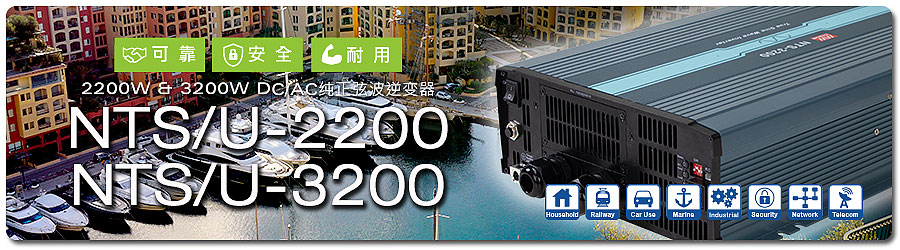 明緯逆變器NTS/ NTU-2200/ 3200有別于一般市售消費性等級,最大特色是采工業(yè)級高可靠、高安全性、高質(zhì)量并融入環(huán)保高效能概念設(shè)計,且導(dǎo)入全新數(shù)字化智能芯片及嚴(yán)選用料。主要特點有 : 瞬間功率可達(dá)2倍、可彈性自調(diào)AC輸出電壓/頻率及節(jié)能模式、遠(yuǎn)程ON/OFF遙控、多重智能保護(hù)(異常自動關(guān)機(jī))、可操作于-25~+70℃、規(guī)劃有歐/美/中國/萬用插及端子臺式多種AC輸出插座、通過國際認(rèn)證及3年長效保固…等。適用于家用/辦公室、車用、游艇、偏遠(yuǎn)地區(qū)無AC電力網(wǎng)、移動式AC行動電源、安控與消防備援不斷電系統(tǒng)…等場合,如:驅(qū)動電視、計算機(jī)、手機(jī)充電、音響、照明、電扇、移動式醫(yī)用推車、移動式燈塔…等。